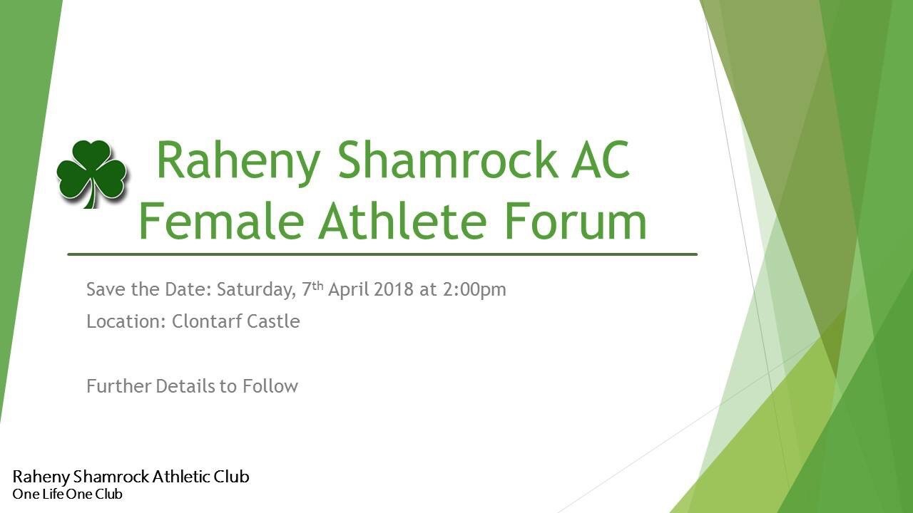 Female Athlete Forum Posted By Dave Hooper on 09/03/2018 Our female athletes are asked to save the date for the female athlete forum which is being organised by ladies road & cross country captain Orla Manley. Details are;